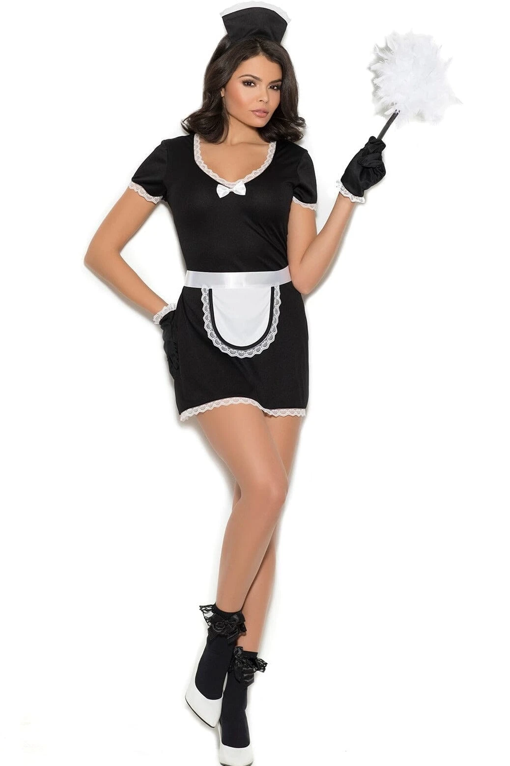 ?4 Piece Flirty Maid Costume includes mini dress, apron, headpiece and gloves.