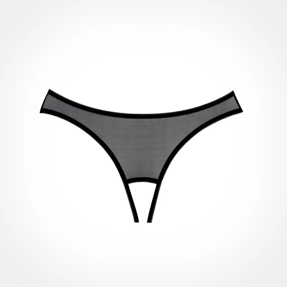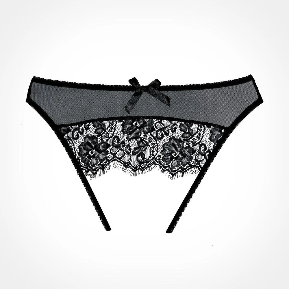 Hidden desires revealed in this seemingly secretive sheer mesh crotchless panty, with eyelash lace caressing the ouverte derriere. That it is topped with a bow is a wink of sweet, sprinkled over a flow of naughty.