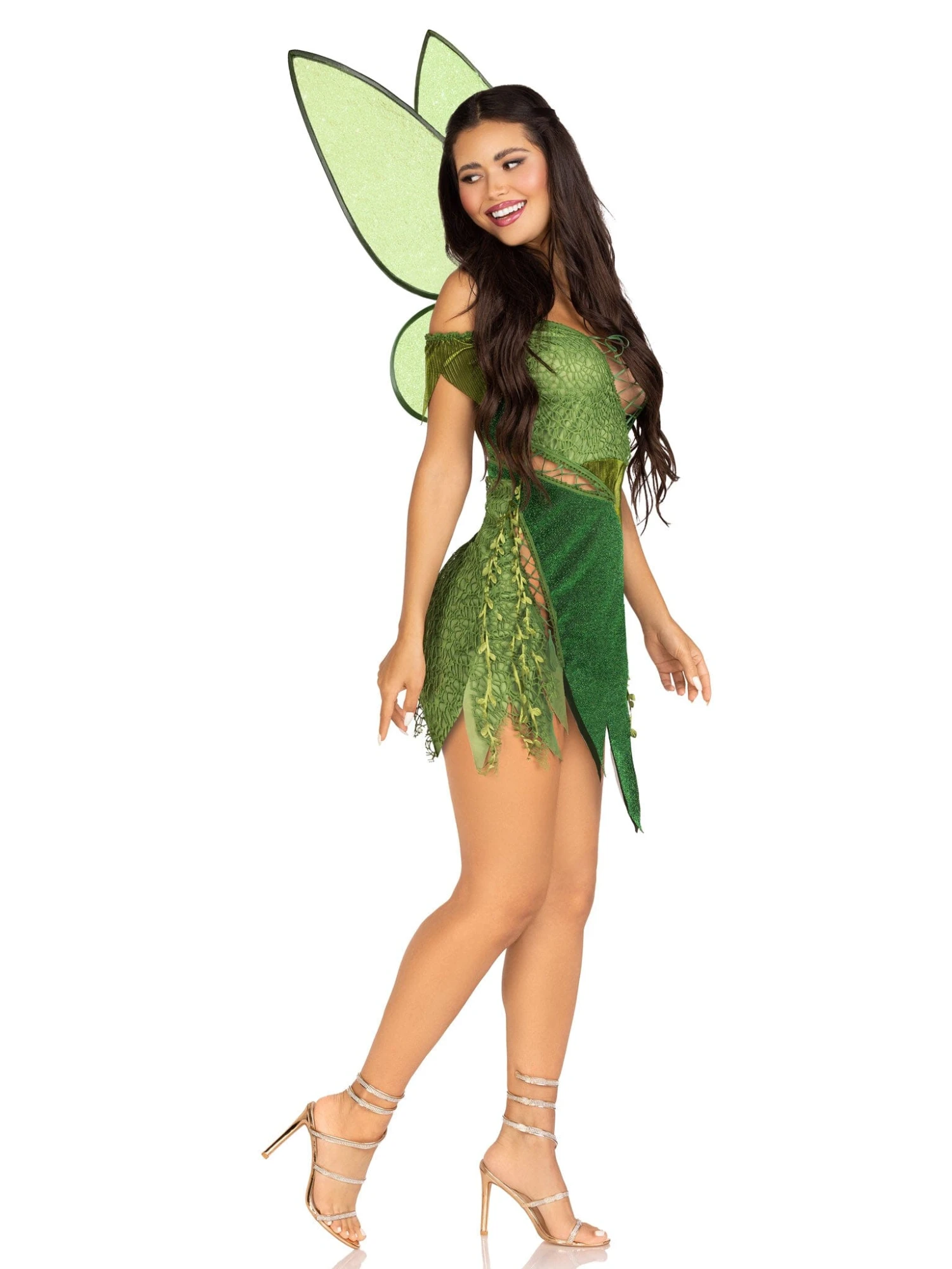 3 Piece Forest Fairy, includes patchwork dress with adjustable lace ups and tattered skirt, leaf accents, detachable clear straps, and shimmer fairy wings.