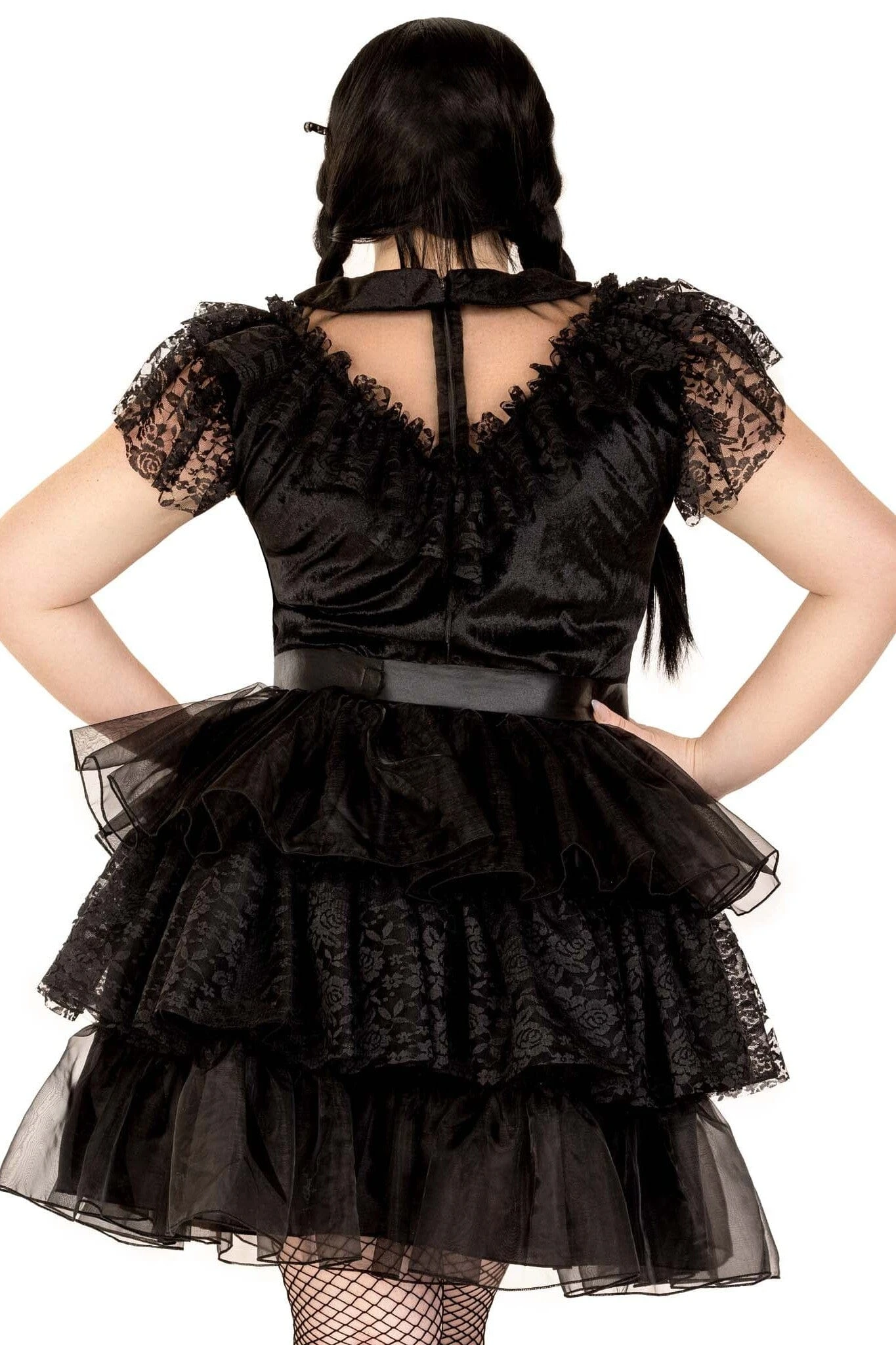 3 Piece Raving Rebel, includes velvet and lace dress with organza tiered skirt, belt, and knife hair clip.
