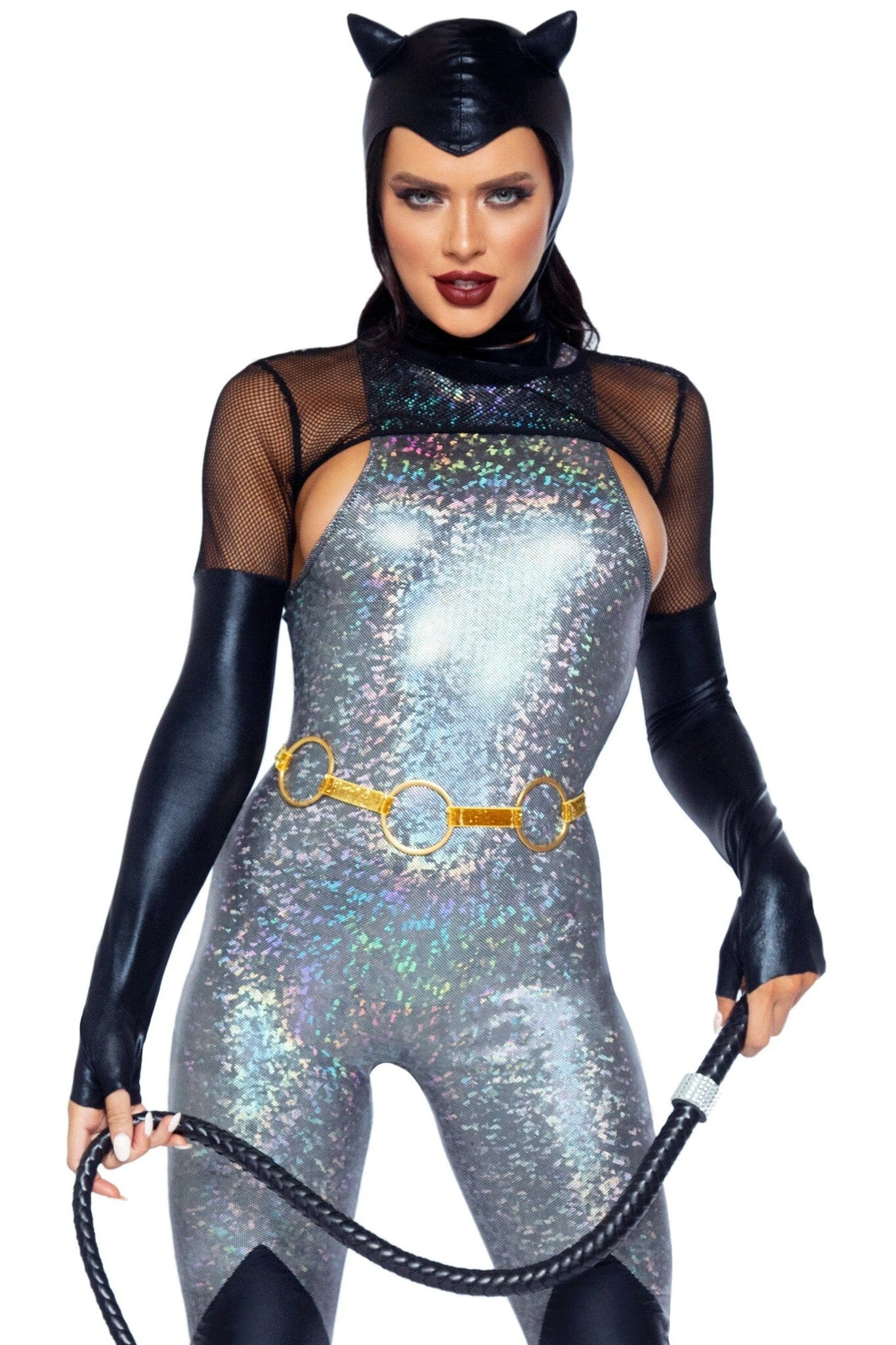 4 Piece Feline Felon, includes holographic catsuit with boot detail, fishnet gloved shrug, cat ear skull cap, and belt.