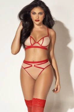 Two-piece set in nude mesh with contrasting red accents. Top with supportive underwire, high waisted panty with heart-shaped hardware detail. Adjustable straps, medium coverage.