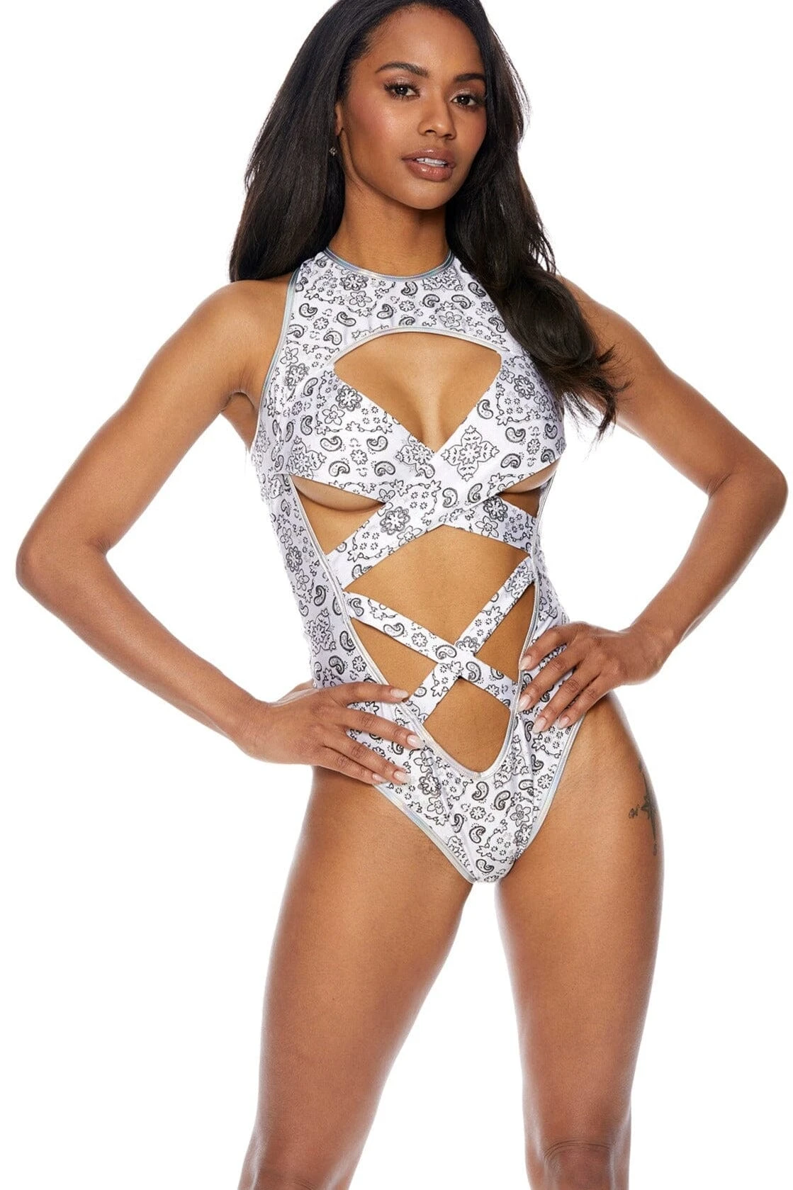 Handkerchief paisley Swimwear bodysuit with open racer back fully lined criss cross front cups and thong panty. Colors: Black, Red, White. Size: One Size. Swimwear/Dancewear.