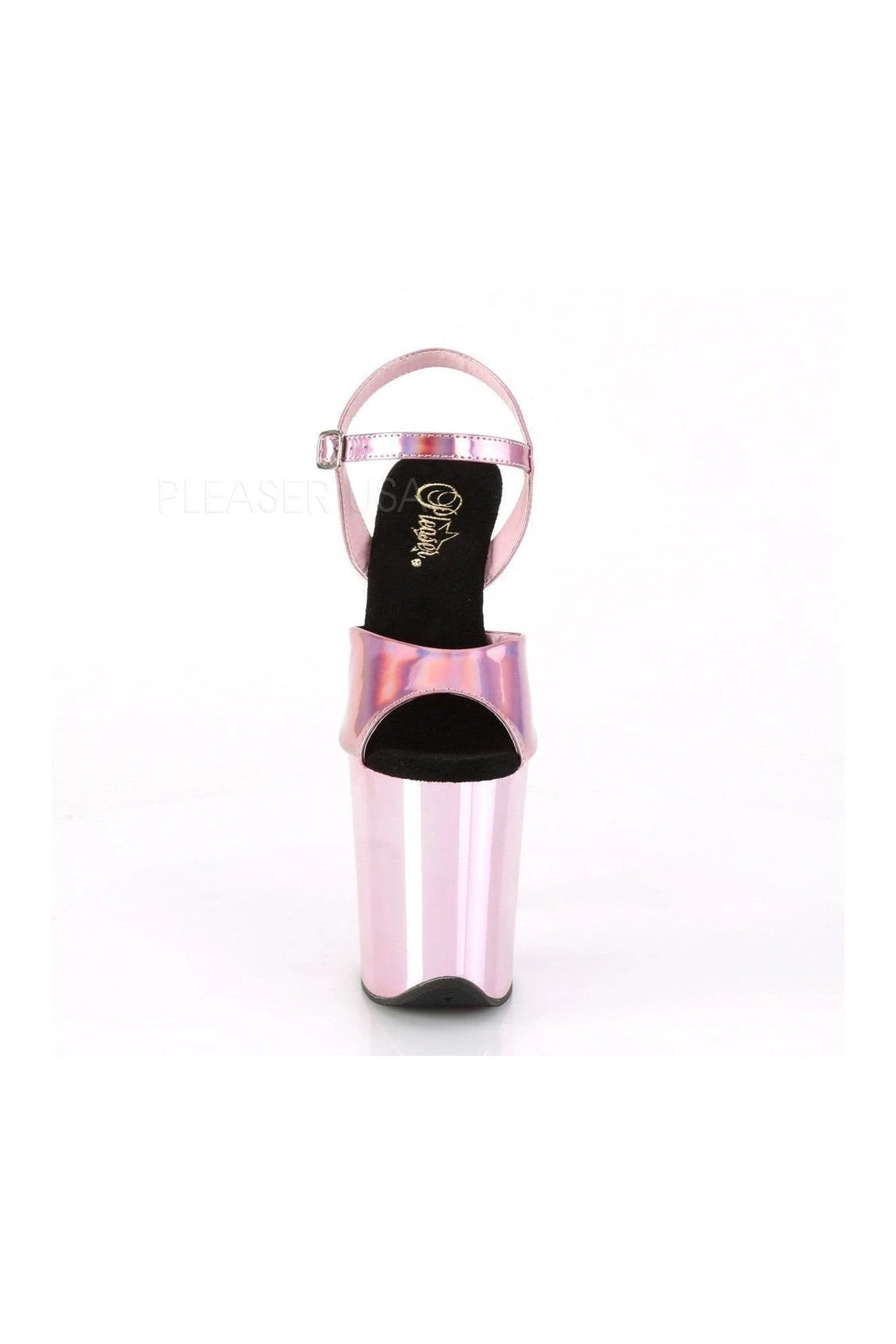 8″” (200mm) Heel, 4″” (100mm) Platform Ankle Strap Sandal w/ Chrome Plated Platform Bottom
