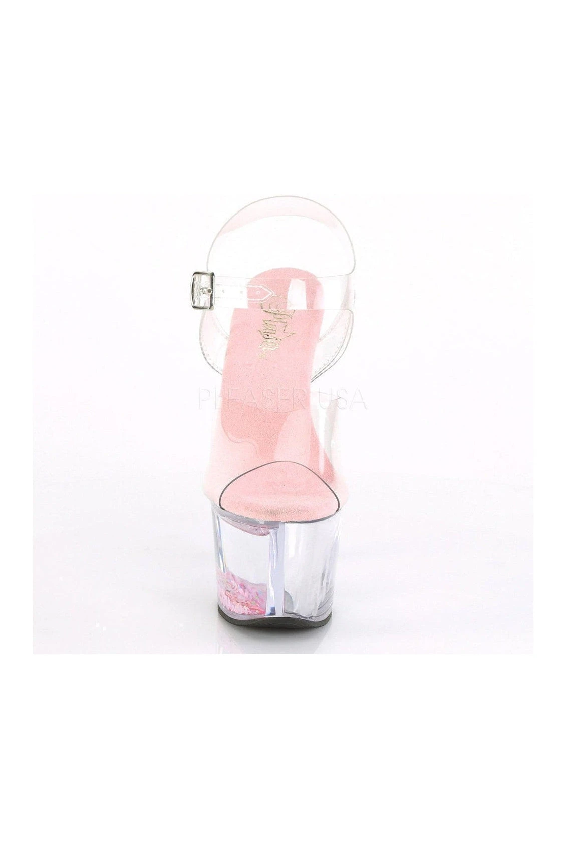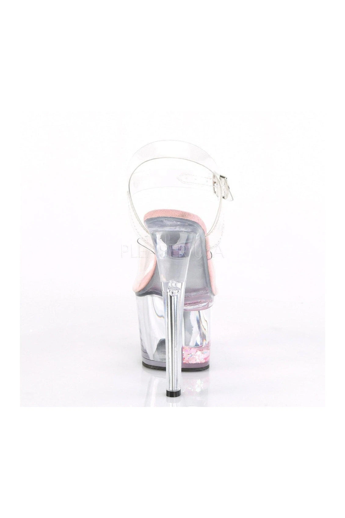 7″ (178mm) Heel,, 2 3/4″ (70mm) Platform Ankle Strap Sandal Featuring the Platform Infused with Flowing Liquid & Floating Glitter Hearts